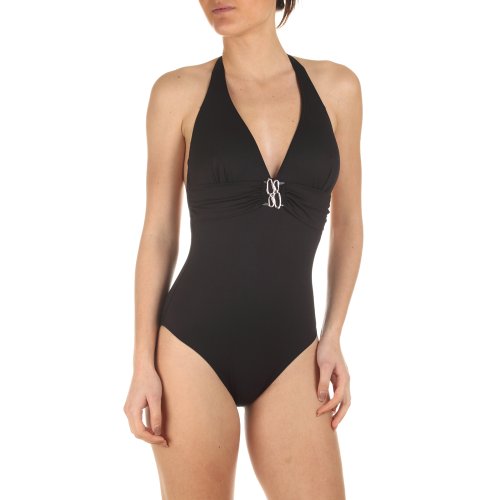 Maillot de bain une pièce foulard, tissu noir. Noué cou par de larges attaches. Maillot accessoirisé d'une bande sous poitrine et d'un bijou au centre de la poitrine. Convient à tous types de bonnets. Bijou antiallérgIque.Composition : 92% polyamide8% élasthanne
