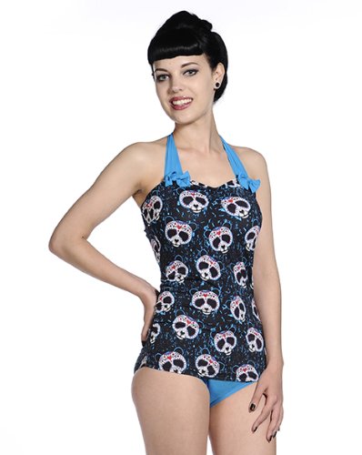 Ce maillot de bain de Banni Wear Alternative a un effet tankini avec les fonds détachés à l'avant et fixé à l'arrière. Le buste est en forme et rembourré (coussinets amovibles) et les meilleurs liens avec bretelles dos nu. Sur un fond noir avec des détails bleu et bretelles dos nu, la tendance partout dispose d'une conception de crâne de panda de bonbons. La tendance se poursuit sur le dos de ce maillot de bain, également avec deux coutures courir dans la longueur allongée et flatter votre silhouette Les principales caractéristiques de Candy Panda Maillot Banni comprennent;.
