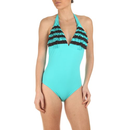 Maillot de bain 1 pièce foulard &ndash. Noué cou par de larges attaches. Dos ouvert. Coloris : Aqua avec petits volants sur les seinsComposition : 72% polyamide28% élasthanne