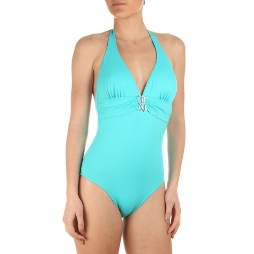 Maillot de bain une pièce foulard, tissu aqua. Noué cou par de larges attaches. Maillot accessoirisé d'une bande sous poitrine et d'un bijou au centre de la poitrine. Convient à tous types de bonnets. Bijou antiallérgIque.Composition : 92% polyamide8% élasthanne