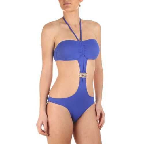 Accessoirisé d'un bijou en métal centré sur le ventre. Fronçage au centre des bonnets par des liens à nouer au cou pour un meilleur maintien. Bijou antiallérgique.Composition : 92% polyamide8% élasthanne