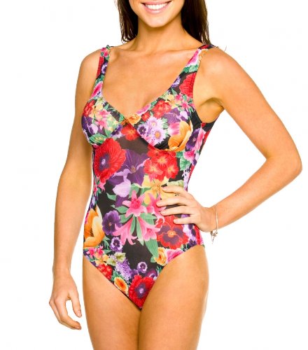 Une coupe classique à façonner et à flatter, notre assistance haut de maillot de bain offre un confort et impertinence dans des mesures égales. Fleurs doucement recueillie créer le bouquet le plus élégant pour le soleil d'été. Notre Lulu impression captures rouges, violets, verts et jaunes sur un fond sombre minceur.