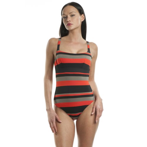 Maillot de bain 1 pièce avec une large bande sous poitrine à rayures orange, taupe et noir. Brassière incorporée invisible assurant un parfait maintien. Composition :89% polyamide, 11% elasthanne
